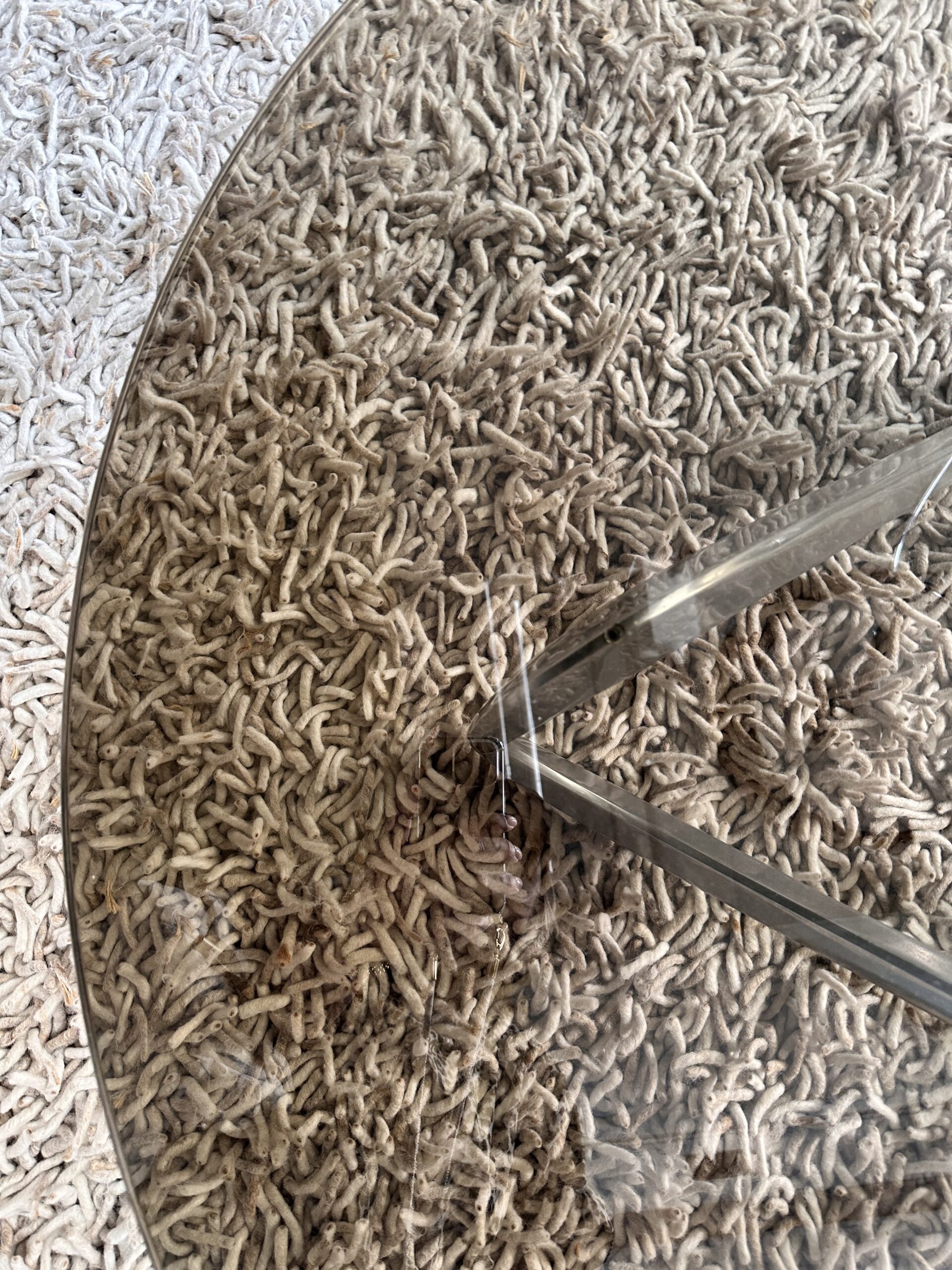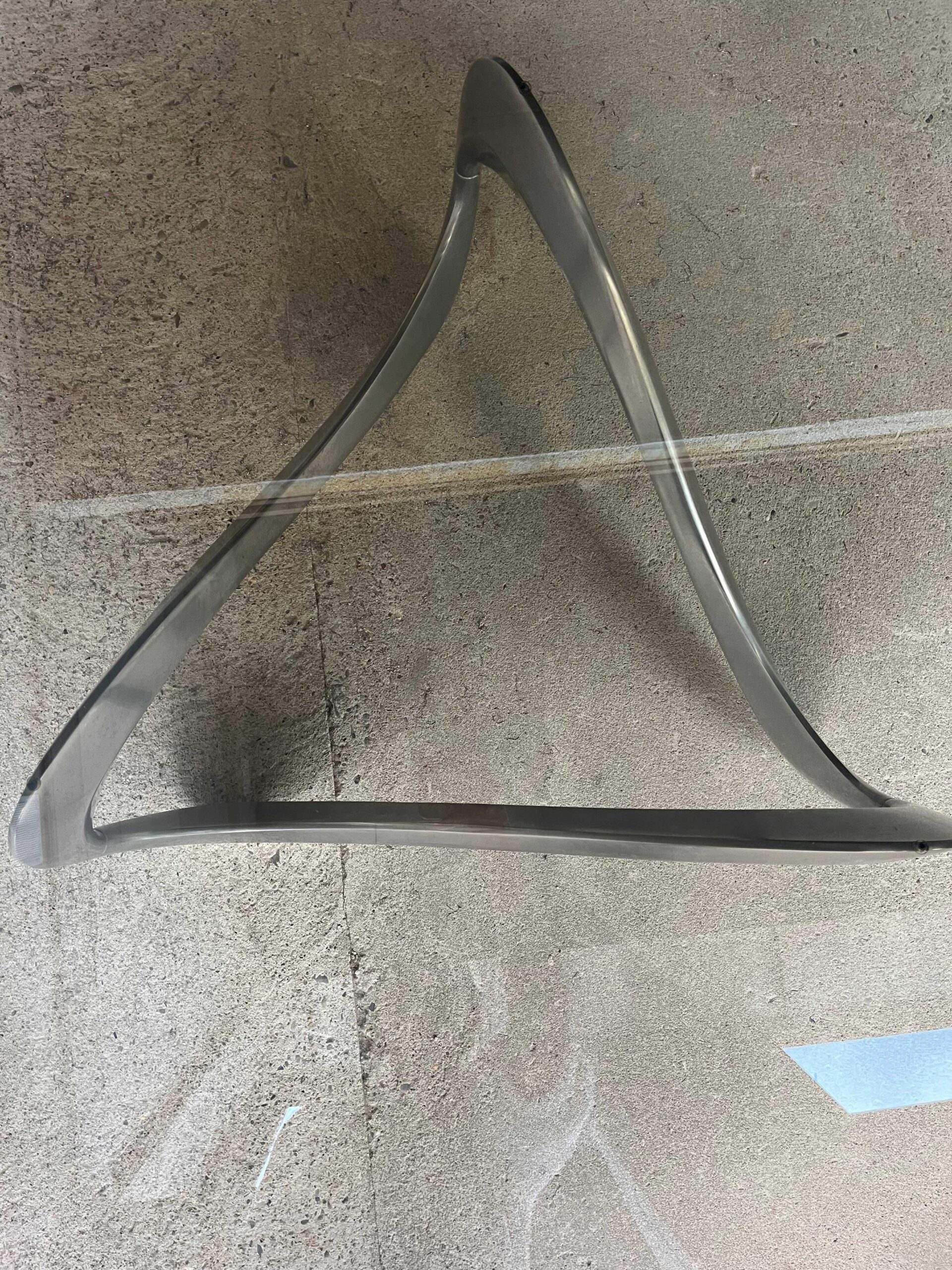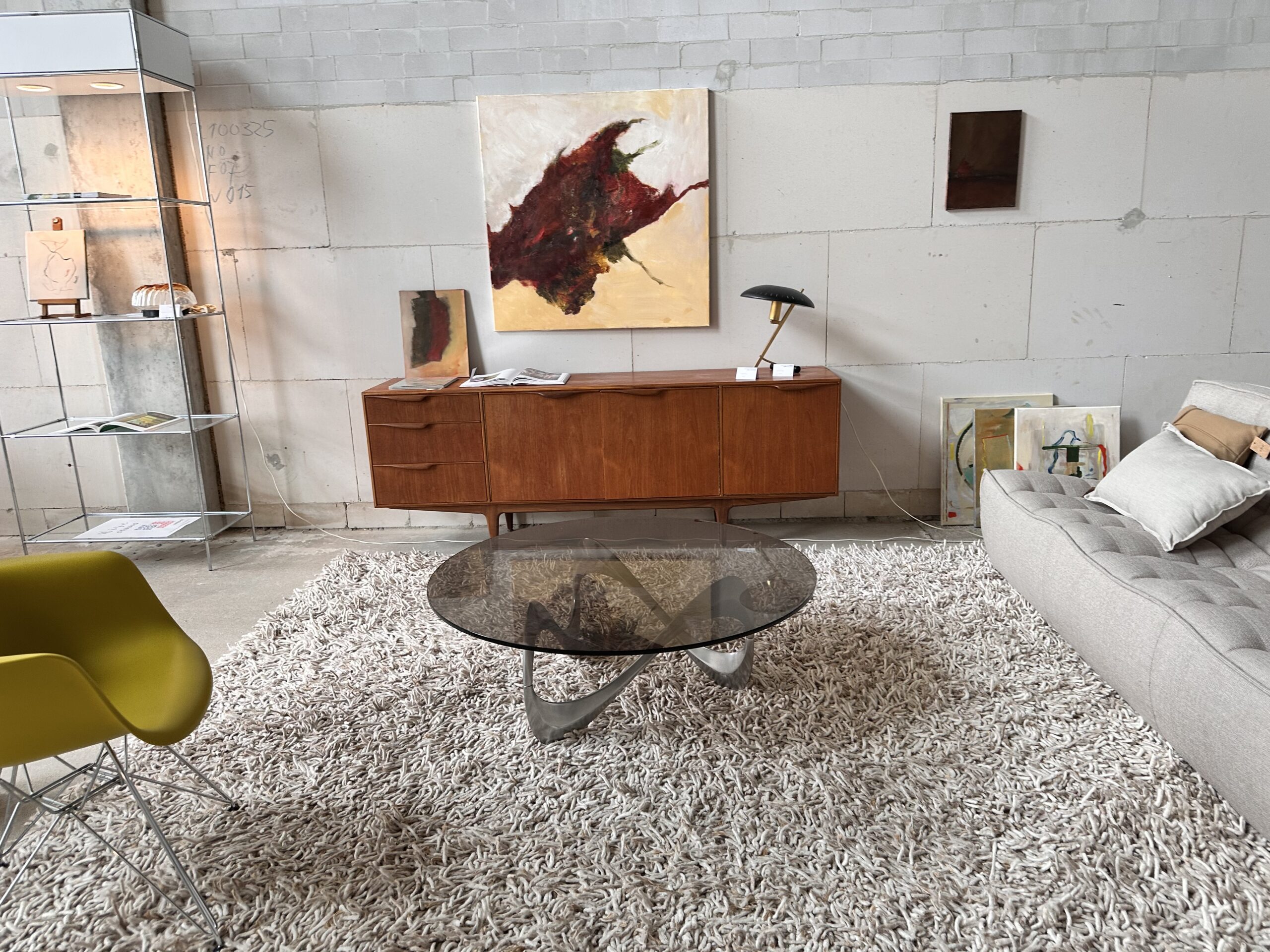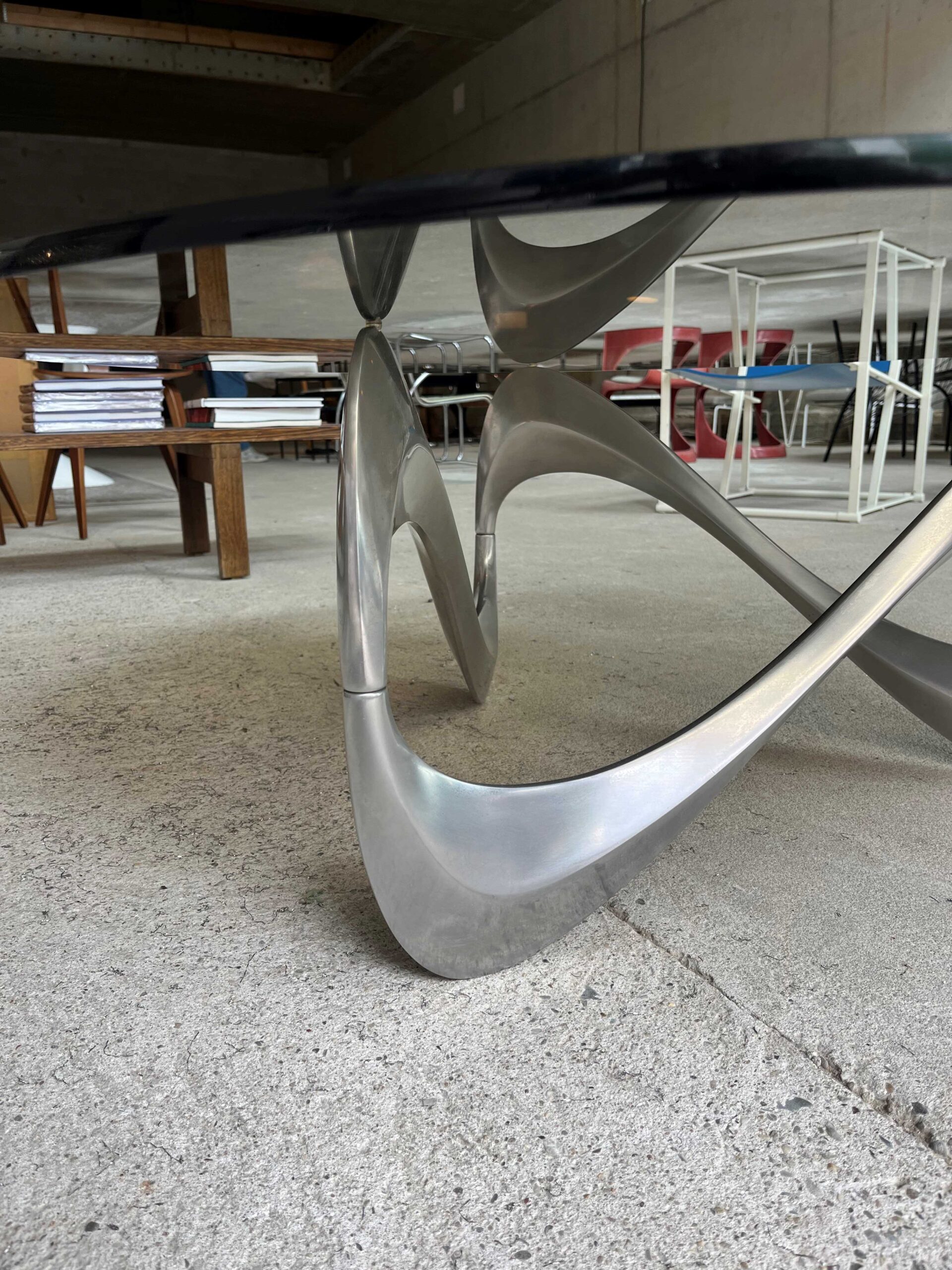 Salontafel “Snake” van Knut Hesterberg voor Ronald Schmitt (Duitsland, circa 1970). De tafel heeft een rond rookglazen blad in zeer mooie staat. Het onderstel is aluminium.